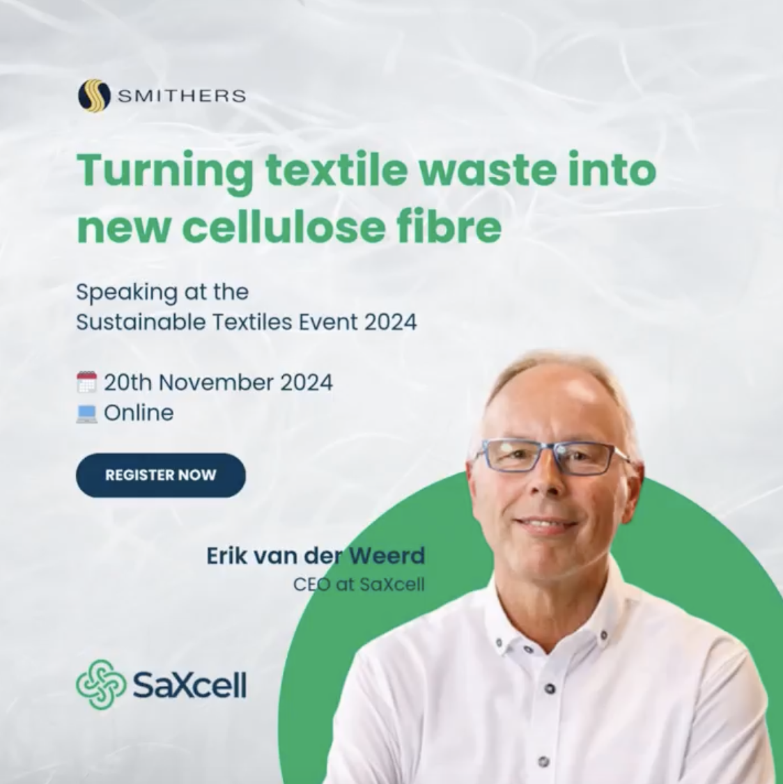 Join us at the Sustainable Textiles Event 2024, hosted by Smithers, where our CEO, Erik van der Weerd, will present how SaXcell is transforming textile waste into high-quality cellulose fibers.